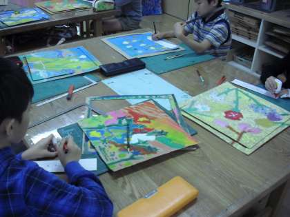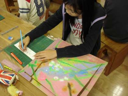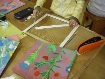 5年生の図画工作の授業の様子です。展覧会に向けて、作品の額縁を作っているところです。作品のまわりを切りとって、テープで裏打ちしながら作ります。ちょっとした工夫で、作品がより一層ひきたちます。