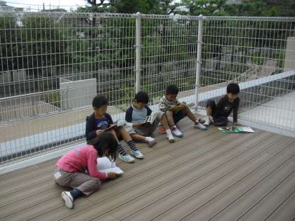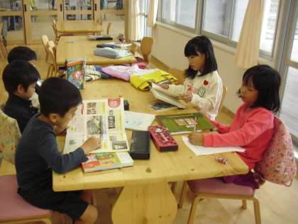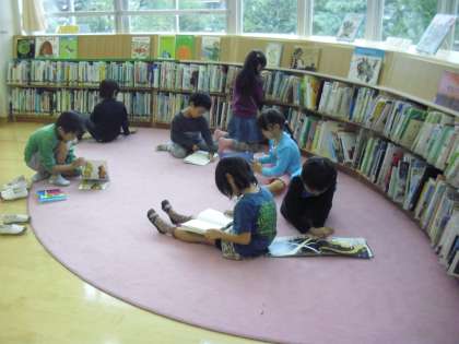 1年生の図書の時間の様子です。テラスで、カーペットで、机で・・・。自分のお気に入りの場所で、本に親しんでいるところです。読書月間は、今月で終わりますが、年間を通して読書活動を推進していきます。
