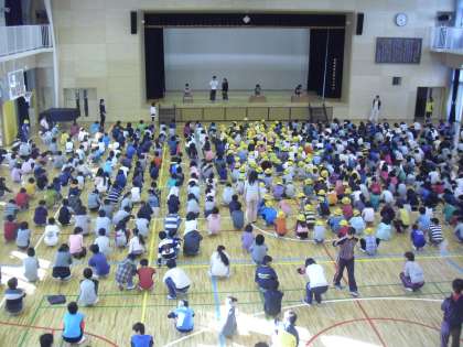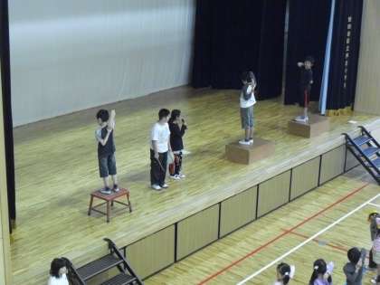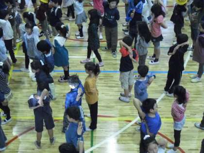 今朝の児童集会の様子です。今回は、集会委員会の企画で、集会委員会が考えた8つのポーズや動きをみんなが真似ます。全部できるでしょうか。まずは、簡単なポーズからです。低学年は、できるととてもうれしそうでした。