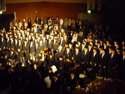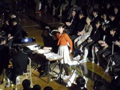 合唱コンクールの審査員の一人として、本校の音楽専科の教員も参加しました。そして、3年生の合唱コンクールです。全体で、共通課題曲「信じる」を歌います。混声三部合唱の美しいハーモニーが体育館に響きます。