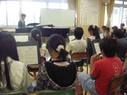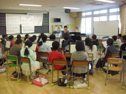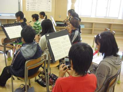 6年生の音楽の授業の様子です。新しい曲をリコーダーで演奏しているところです。はじめに音楽の先生の演奏を聴きながら、楽譜と照らし合わせてイメージをつかみます。そのあとに練習をしました。
