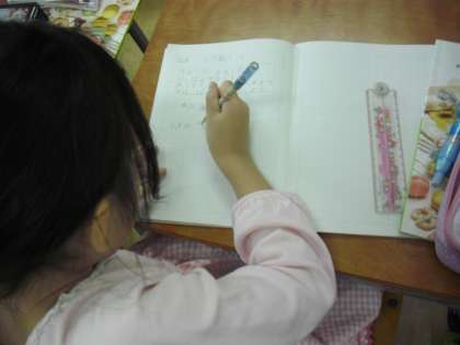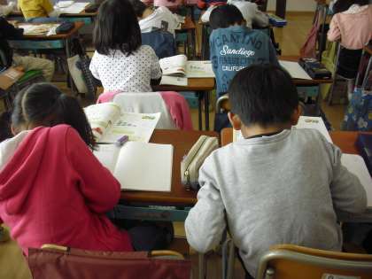 2年生の算数の授業の様子です。2年生はかけ算の学習の真っ最中です。文章の問題文をノートに写してから、かけ算の考え方を絵図で表しているところです。暗唱するだけでなく、考え方をしっかりと理解していきます。