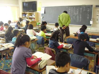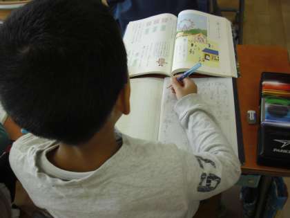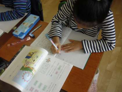 2年生の国語の授業の様子です。教科書の絵を見ながら、主語と述語を考えて文章を作ってノートに書いているところです。絵の内容の受け止め方で、主語も述語もかわってきます。熱心に取り組んでいました。