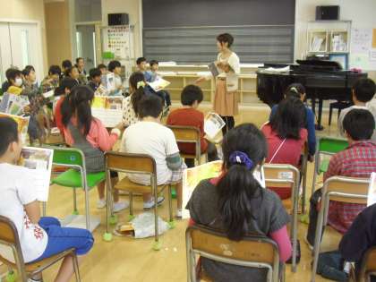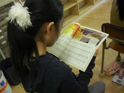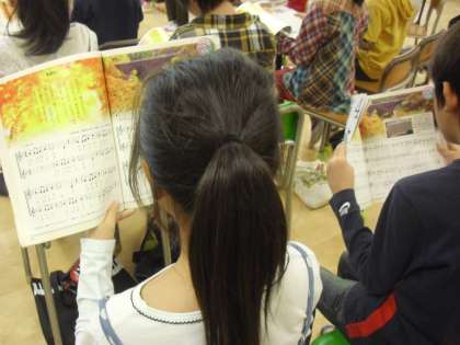 4年生の音楽の授業の様子です。「もみじ」を歌っているところです。歌詞の意味を理解し、情景を思い浮かべながら取り組んでいます。楽譜を見ながら音程をとる力も身に付けていきます。