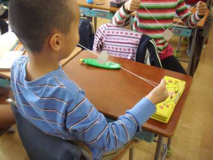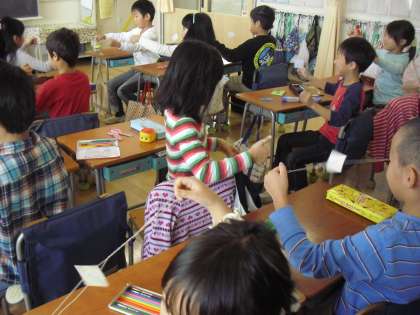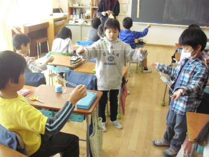 2年生の生活科の授業の様子です。ブンブンゴマを作って、みんなで楽しんでいるところです。勢いよく回すことができると「ブ〜ン」という音が出ます。生活科では、昔遊びに親しむ学習にも取り組んでいきます。