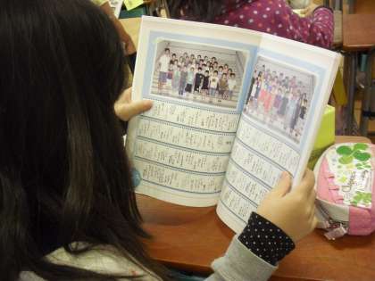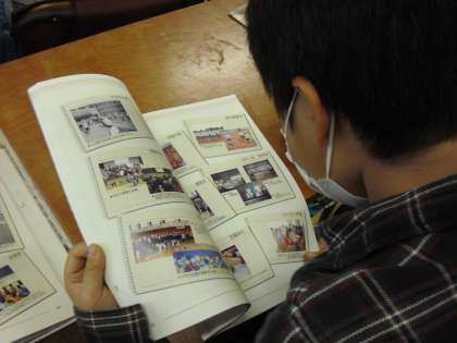 朝、教室で記念誌や記念品を手にする子どもたちの様子です。自分のクラスの写真や記念品を手に喜ぶ子どもたち。小中合作の記念誌は、学校・地域の紹介だけでなく、卒業生の座談会等、盛りだくさんの内容です。