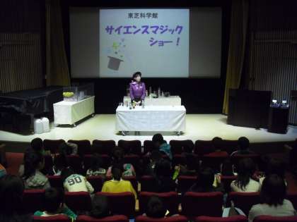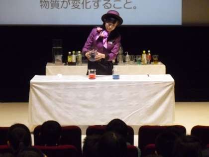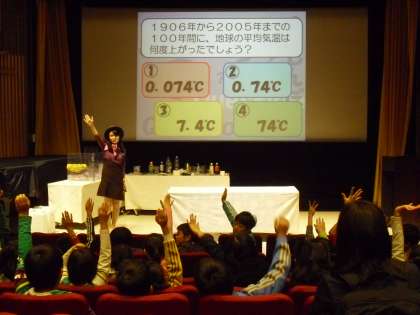 最後は、ホールで科学実験教室や環境クイズで楽しみました。科学実験教室では、子どもたちも知っている化学反応を活用した実験をはじめ、視覚的に楽しめる実験ばかりでした。子どもたちも自分の知識と結びつけて考えていました。