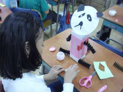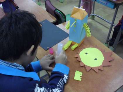 2年生の図画工作の授業の様子です。自分の好きな動物作りも進み、細かな工夫を取り入れて工夫をしています。表情も出てきて今にも動き出しそうな感じです。