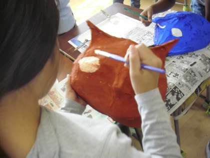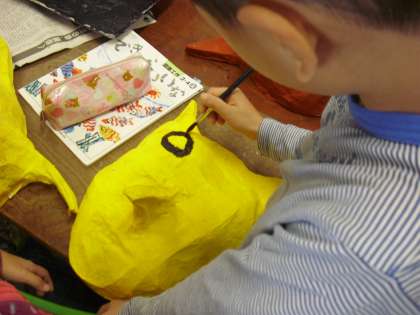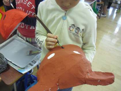 3年生の図画工作の様子です。単色のお面に表情を描いているところです。まん丸な目や小さな目、様々です。中学年では、表したいことを形、色、材料の特徴を生かして表現する力を身に付けさせます。