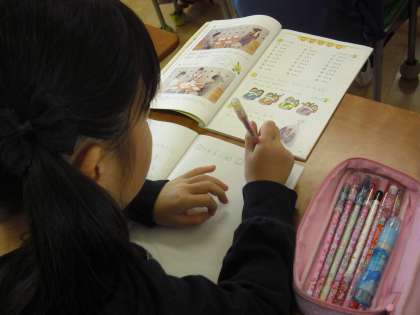 2年生の算数の授業の様子です。教科書のかけ算の問題を、ノートに書き写しながら解いているところです。正確に解くことだけでなく、整理して書くことや、丁寧に書くことも指導しています。