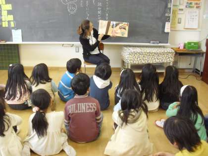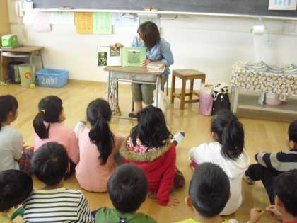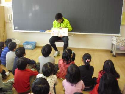 読み聞かせを通して、たくさんの方々と子どもたちはふれあいます。あるクラスでは教育実習生が読み聞かせをしていました。実習生にとっても貴重な体験です。様々な分野のお話にふれ、子どもたちの興味や関心が広がります。