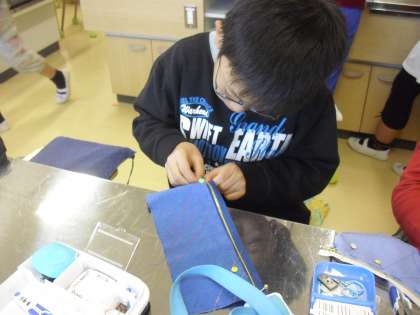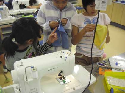 5年生の家庭科の授業の様子です。小物入れの製作に取り組んでいるところです。作品が完成している人は、次の課題にとりかかっていますが、友達が困っていると進んで声をかけて教えている姿が見られます。