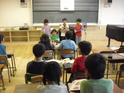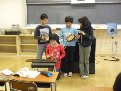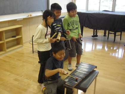 3年生の音楽の授業の様子です。教科書の「まほうつかいの歌」の学習で、魔法を使ったときの音をグループ毎に打楽器を使って創作し、発表しているところです。楽しく想像しながら音を奏でていました。