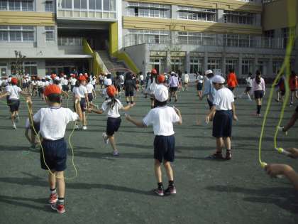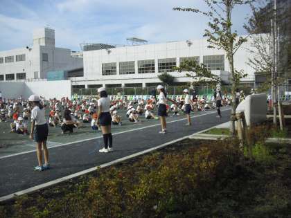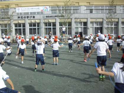 運動委員会が紹介する技をみんなでいっしょに取り組んでいるところです。これから休み時間や昼休みには、運動委員会による「なわとび検定」もあります。スポーツの秋!なわ跳び運動で体力アップです。