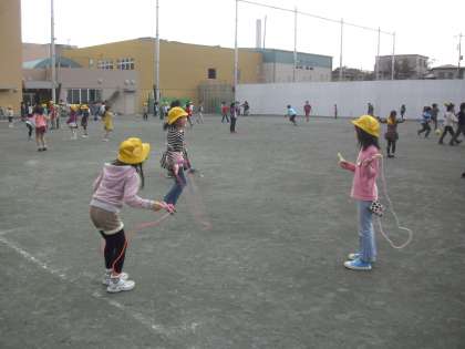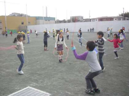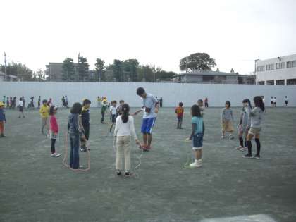 休み時間の様子です。短なわを手に校庭に出てきた子どもたち。体育朝会で話があったように、今日から「なわとび月間」です。早速、短なわ跳びの練習をしています。友達と競い合ったり、体育講師の先生に教えてもらったりしながら体を動かしていました。
