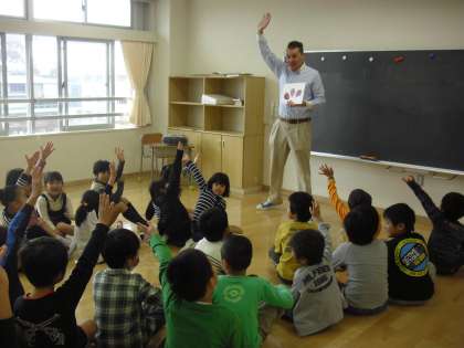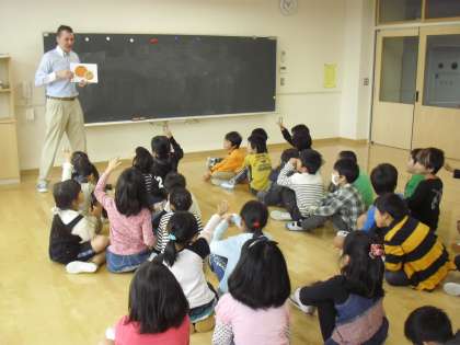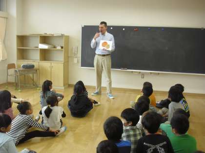 2年生の英語活動の授業の様子です。今日はくだものの名前がテーマです。絵カードに描かれているくだものの名前をALTの先生の後に従って英語で発音します。みんなくだものは大すきなようです。