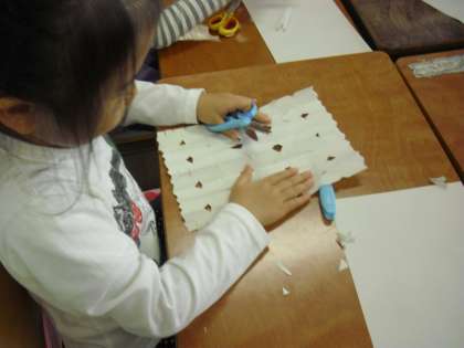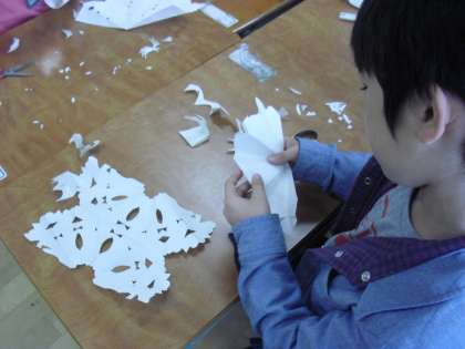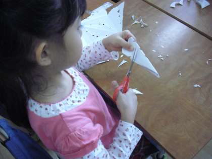 1年生の図画工作の授業の様子です。おめでとうバースデーケーキの下に敷く飾りの紙を作っているところです・紙を折って、部分的に切りとって、開いてみると……不思議な模様ができあがりました。