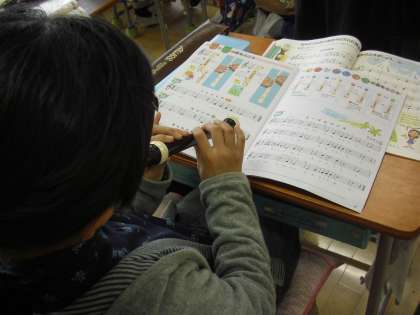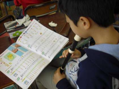 3年生の音楽の授業の様子です。3年生になってから取り組みだしたリコーダーですが、いろいろな曲を練習する中で、指使いも演奏の仕方も上手になってきました。ページをめくっては、これまで学習した曲を吹いています。