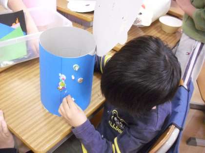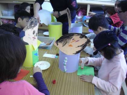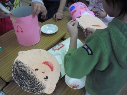 ひかり学級の図画工作の授業の様子です。自分に見立てた作品を作っているところです。色をぬったり、ボタンを付けたり、一生懸命に取り組んでいます。きっと、作品から子どもたちの努力が伝わると思います。