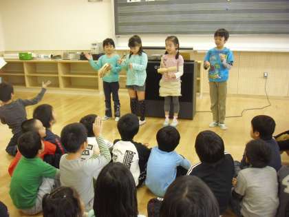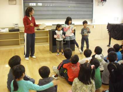 2年生の音楽の授業の様子です。打楽器を使って、リズム打ちを楽しんでいるところです。みんなでそろうと楽しそうです。使っている楽器を次の友達へわたしてみんなで体験します。教育実習生も参加しました。