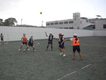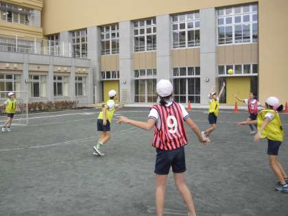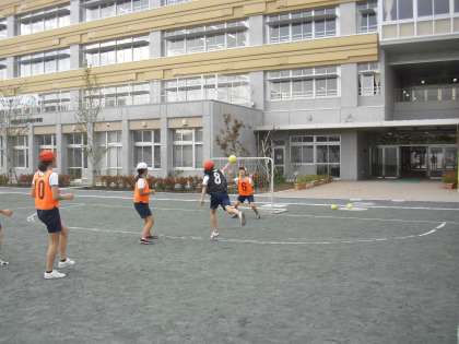 6年生の体育の授業の様子です。校庭でハンドボールの学習をしているところです。ボールも手ごろの大きさなので、パスも出しやすく、運動量も多い運動です。攻防の切りかえとスピードが必要です。