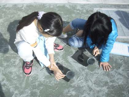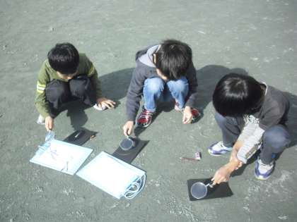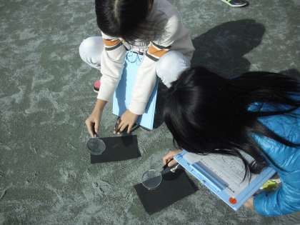 3年生の理科の授業の様子です。校庭で虫めがねを使って、太陽の光を集めているところです。黒い紙に太陽の光を集め、その変化を観察しています。実験は安全に十分に気を付けて進めています。