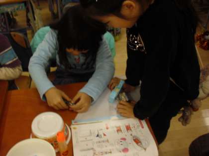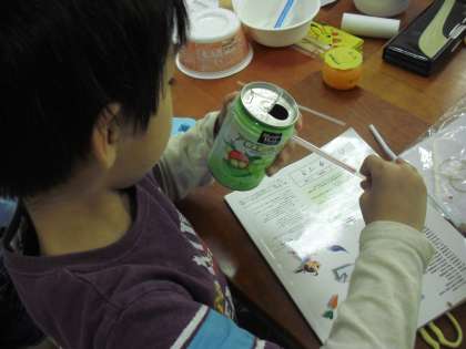2年生の生活科の授業の様子です。手作りおもちゃを作っているところです。空き缶、ストロー、はり金、アルミホイル、電池、紙皿等を使って、動くおもちゃを作っています。「先生、見て!」とできたおもちゃで遊ぶところを見せてくれました。