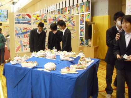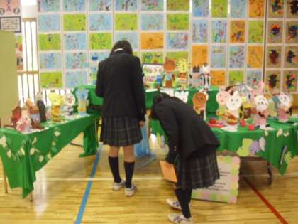 本日、明日と展覧会を行っています。児童会テーマ「咲かせよう 十人十色の 笑顔の花を」のもと、子どもたちが授業で取り組んできた作品を展示しています。1時間目には、中学3年生とI組の生徒が鑑賞に来てくれました。たくさんの方々のご来校をお待ちしております。