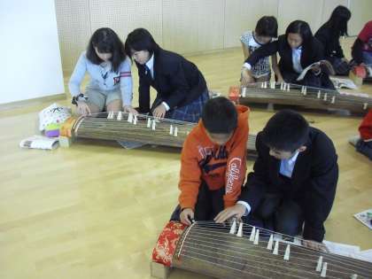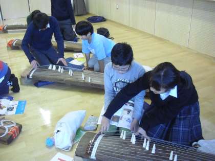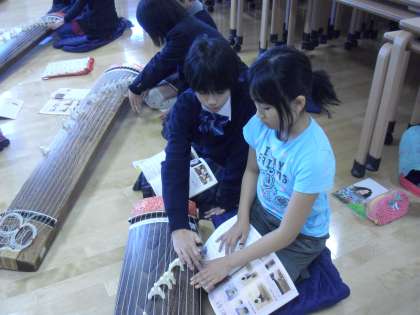 5年生と中学1年生の琴の交流授業の様子です。「さくら」を課題曲として、中学1年生が5年生に琴の弾き方を教えてくれます。中学生はとても丁寧にやさしく接しています。5年生も安心して琴を演奏することができました。芦花ならではの活動です。