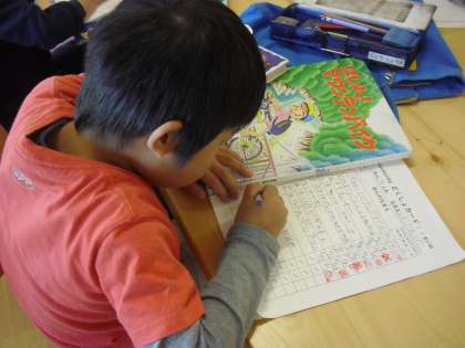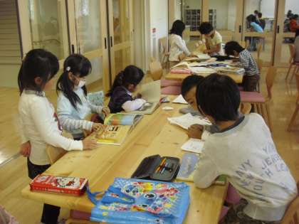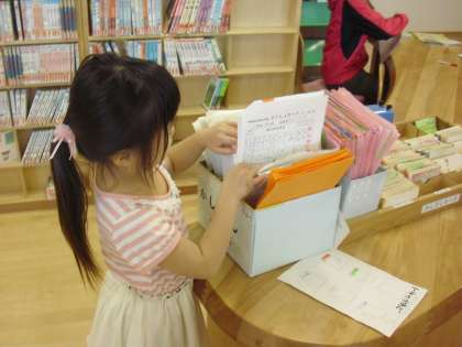 1年生の図書の時間の様子です。自分の図書カードを取り出して、借りる本の名前をカードに自分で記入しているところです。好きな本、お気に入りの本、読んでみたい本、1年生もたくさん本を読んでいます。