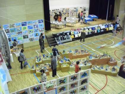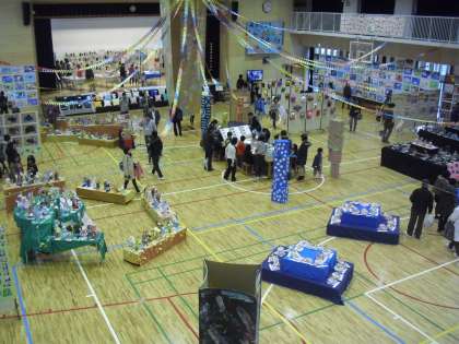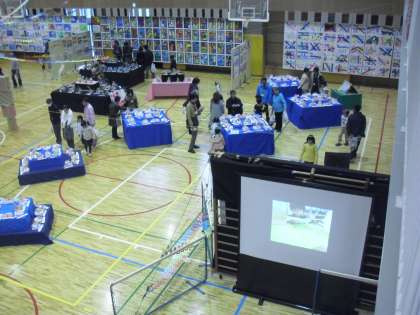 展覧会の午後の様子です。保護者の方といっしょに訪れる子どもたちも多いです。地域の方や旧職員の姿も見られます。たくさんの方々にご鑑賞いただいている展覧会。受付は午後4時30分で終了です。お待ちしております。