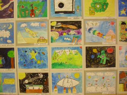4年生の作品を紹介します。平面作品は「まほうの時計」と「自分いろがみ」です。「まほうの時計」は、自分の好きな時刻にセットすると、不思議なことが起こる時計をテーマにした作品です。まほうの時計で起こる出来事を表現しました。