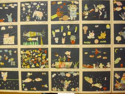 「自分いろがみ」は、マーブリングなど、いろいろな技法を使って、自分だけの色紙を作り、その色紙を用いて想像した物語を描いた作品です。