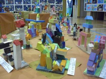立体作品は「つみキング城」です。のこぎりを使って自分で木材を切って積み木を作りました。積み木を組み合わせて制作したオリジナルのお城です。
