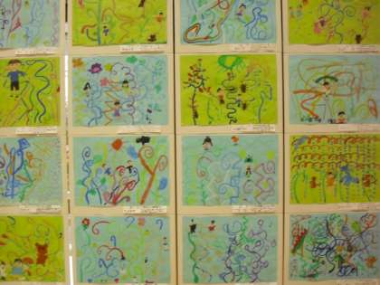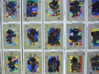 2年生の作品を紹介します。平面作品は「鳥の王様コンテスト」と「ジャングルであそんだら」です。「鳥の王様コンテスト」は、クラッチ(ひっかき)という技法を用いて描いた作品です。「ジャングルであそんだら」は絵の具で描いた線を生かして、そこで遊んでいる自分や友達、家族、森の生き物などを想像して描いた作品です。