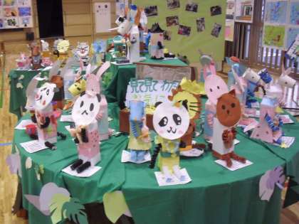 立体作品は「見て見て わたしのたからもの」です。牛乳パックを使って、好きな動物を作りました。動物の手には、大切な宝物が。子どもたちが楽しく作った作品です。
