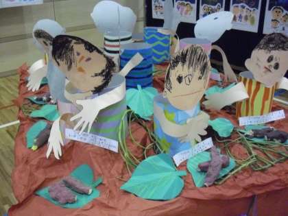 立体作品は、ねん土を使ってサツマイモを作りました。楽しくいもほりをするひかり学級の子どもたちの様子を描いた作品です。
