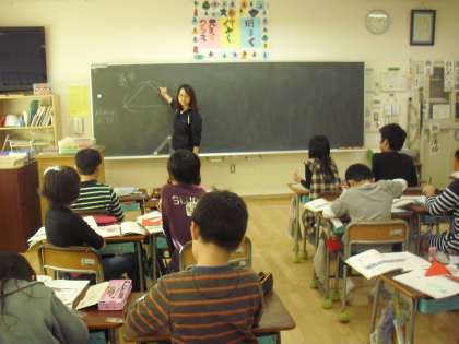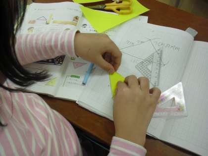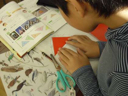 3年生の算数の授業の様子です。三角形について学習しているところです。今日は二等辺三角形の性質を知るために、ノートに作図した二等辺三角形と同じ条件の二等辺三角形を折り紙に作図し、それを用いながら、ふたつの辺が等しいことを調べました。