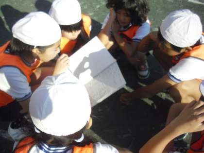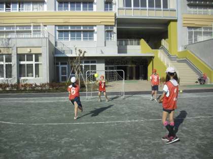 6年生の体育の授業の様子です。ハンドボールの学習に取り組んでいるところです。ゲームだけでなく、チームでの活動は学習の大切なポイントです。ゲームの様相を振り返り、次のゲームに生かす話し合い、チームの課題を達成するための練習等、チームの成長を目指して活動しています。