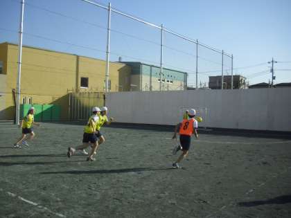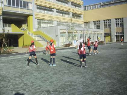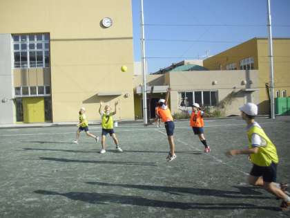 チームの時間で話し合ったことや練習したことを発揮するのがゲームです。チームのめあてや作戦に応じたプレーができるように心がけ、互いの動きを見合いながらゲーム中もコミュニケーションを交わしながらプレーしています。