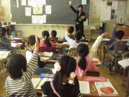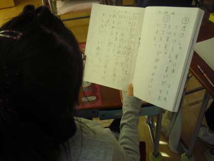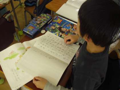 1年生の国語の授業の様子です。「いぬのきもち」の挿し絵の前の場面を想像してノートに書いたことを発表しているところです。お話のストーリーを踏まえて、自分なりに想像したお話を作りました。