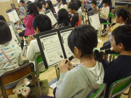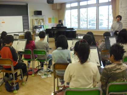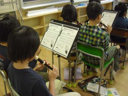 4年生の音楽の授業の様子です。「陽気な船長」という曲をリコーダーで演奏する学習です。曲の特徴を生かして表現できるようにします。スタッカートの意味と演奏の仕方について学びました。