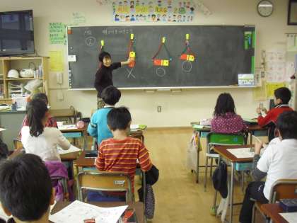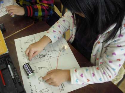 3年生の理科の授業の様子です。乾電池と豆電球を使って、電気を通すつなぎ方を調べているところです。乾電池のいろいろな部分とつなぎ合わせて、電気を通すつなぎ方と通さないつなぎ方があることを学んでいます。