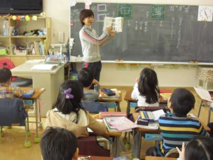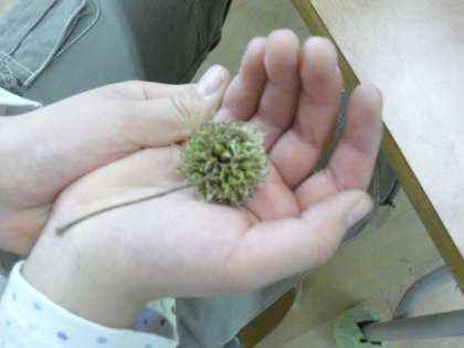 1年生の生活科の授業の様子です。早速、秋探しに出かけたことを学習カードにまとめているところです。「先生、これなんの実?」と、子どもが手にした実を見た担任は、図書室から図鑑をもち出して、調べ方を教えていました。「プラタナスですね。」子どもたちの小さな疑問が、学びを広げていきます。
