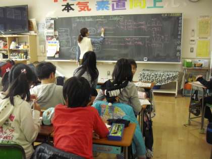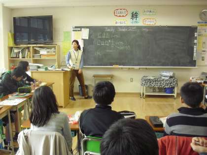 6年生の外国語活動の授業の様子です。今日は「I can ○○.」の会話を行いました。英語支援員の先生の発音を聞きながら、自分たちもくり返します。「I can swim.」「I can play baseball.」自分ができることを会話にしました。