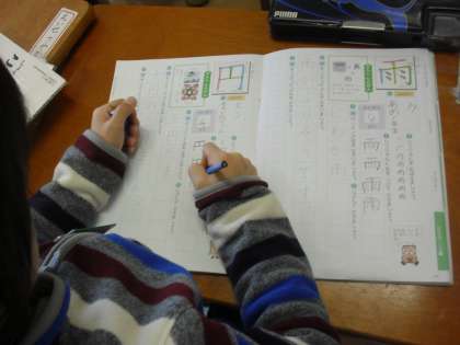 1年生の国語の授業の様子です。今日は「雨」「円」の新しい漢字の練習に取り組んでいます。筆順に気をつけながら、一画一画丁寧に書いています。1年生で学ぶ漢字は全部で80字です。繰り返し練習しながらしっかりと身に付けていきます。