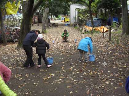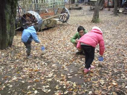 2チームに分かれて、リレー型のゲームをしました。バケツに入ったどんぐりをお玉ですくって、運びます。先にあるペットボトルにこぼさないように入れて、次の人にお玉をバトン代わりにわたします。みんな上手に運ぶことができました。