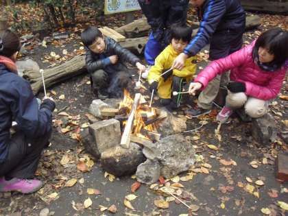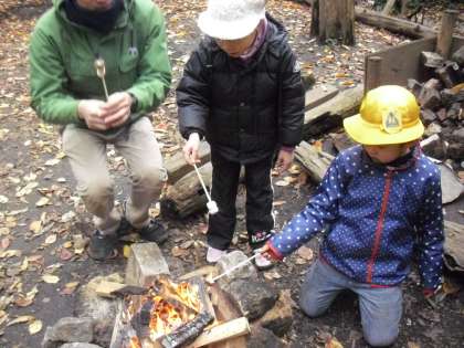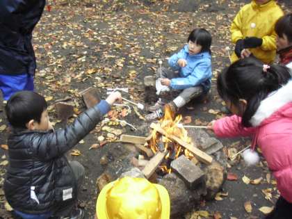 お昼の後のおやつの様子です。火を起こして、マシュマロ焼きをいただきます。自分でマシュマロを割りばしにさして、軽く火であぶると、香ばしいマシュマロ焼きの出来上がり。子どもたちは大喜びでした。