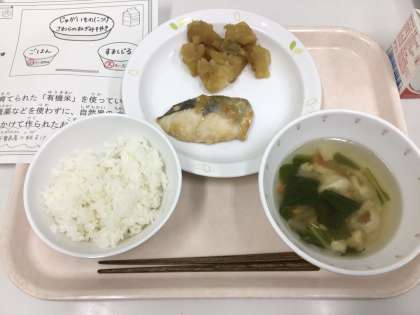 今日は、ごはん、鰆のねぎみそ焼き、じゃがいもの煮つけ、すまし汁、牛乳です。