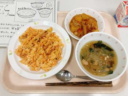 今日は、キムチチャーハン、韓国風肉じゃが、春雨と野菜のスープ、牛乳です。